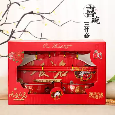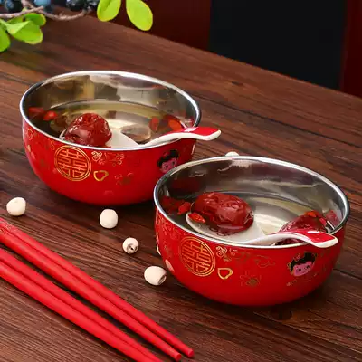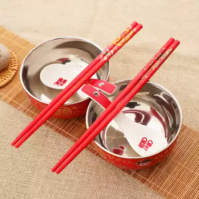 Wedding happy bowl Red chopsticks Wedding women's dowry supplies bowl chopsticks spoon Wedding happy bowl Stainless steel three-piece set