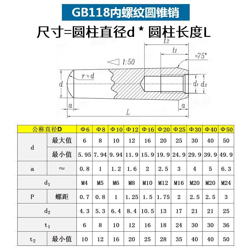 GB118 internal thread conical pin cone positioning 45# steel quenching internal thread cone pin 8*16-100