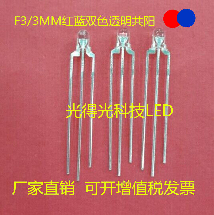 High bright LED lamp beads F3 red and blue two-color transparent co-yin LED light emitting tube 3MM red and blue two-color three-pin diode