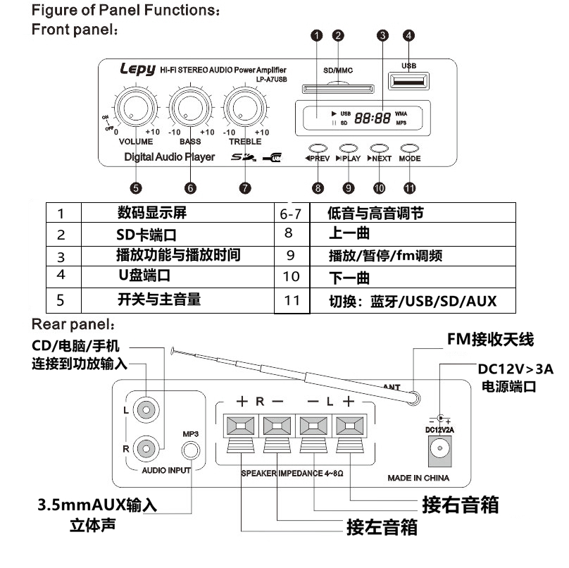 Bluetooth power amplifier Lepai power amplifier A7USB SD FM radio 12V mini small power amplifier card USB power amplifier