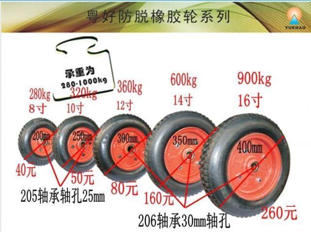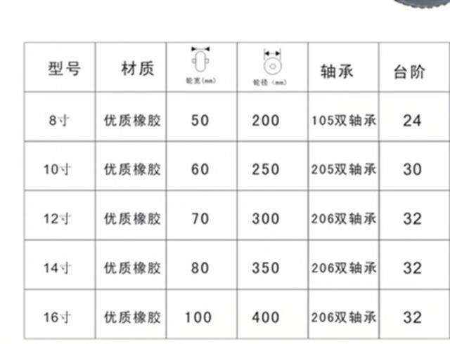 8 inch Single wheel 200m Heavy about 1 7kg10 inch Single wheel 250mm Heavy about 2 7kg12 inch Single wheel 300mm weighs about 5 2kg14 inch Single wheel 350mm Heavy