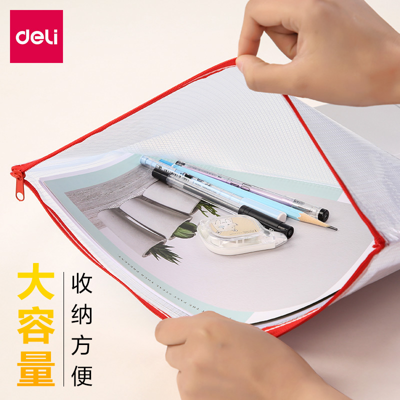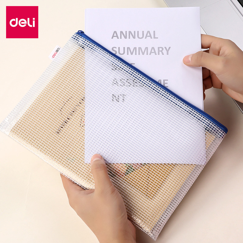 (3-5 pcs)Deli mesh zipper bag Pull side bag A4 waterproof file bag Transparent zipper bag file