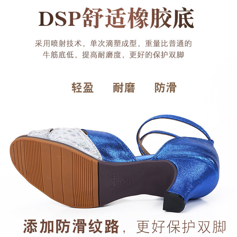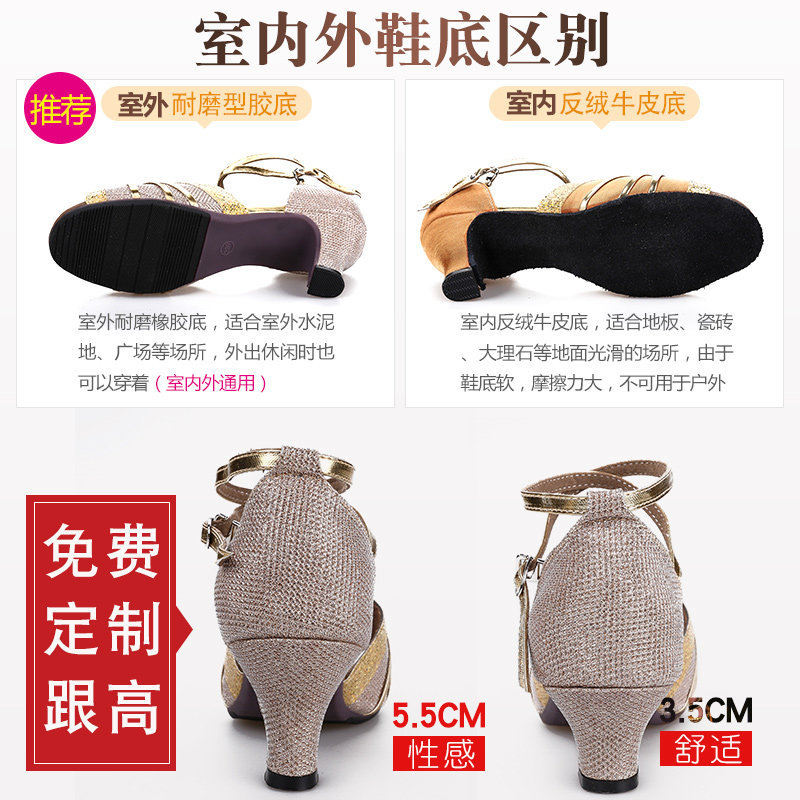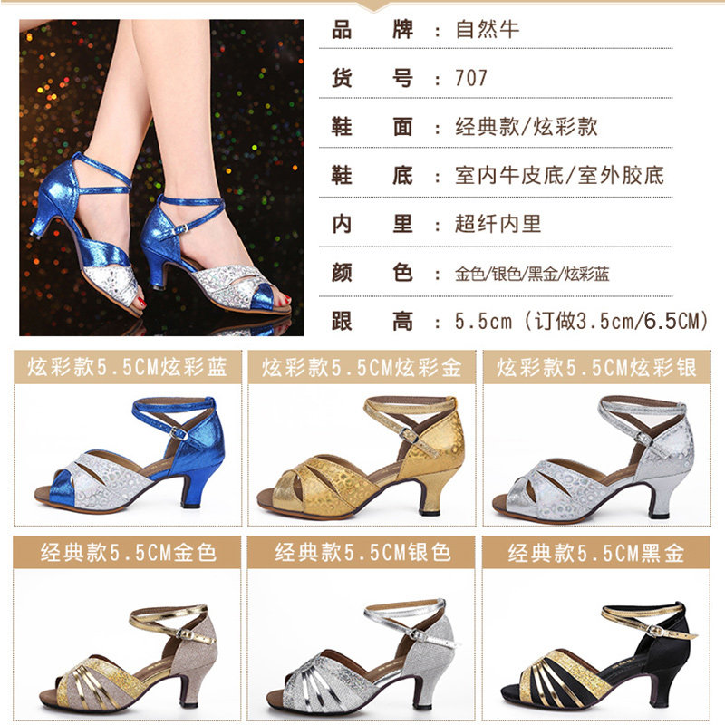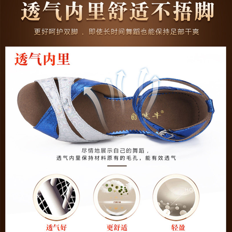 Natural Cow Latin Dance Shoes Female Adult High-heeled Social Dance Shoes Mid-heeled Soft-soled Square Dance Shoes Sandals Four Seasons