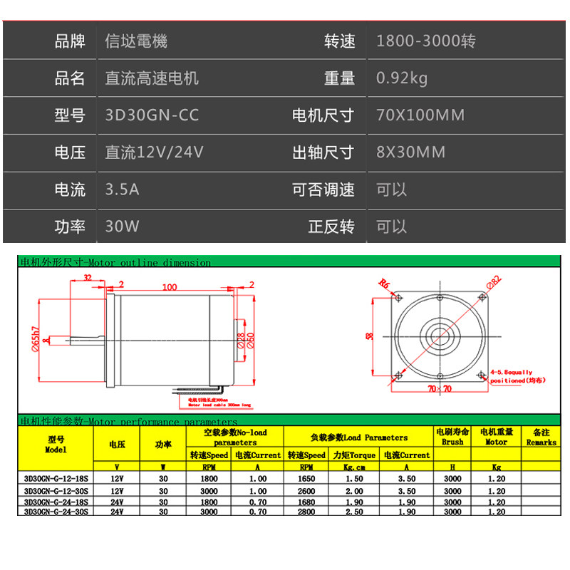 Xinda 30W DC permanent magnet motor 12V24V miniature 1800RPM high speed motor speed regulating positive and negative motor