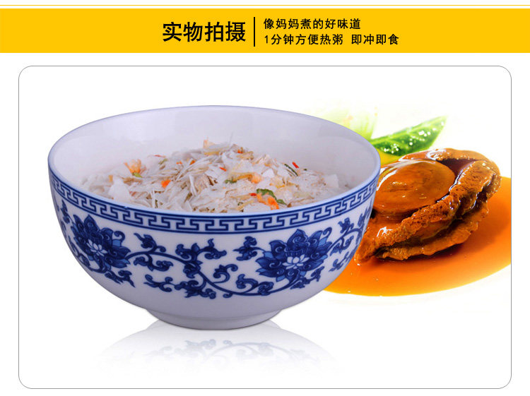 Congee slices (rice sticky rice corn starch) dehydrated pork silk Shrimp Rindry Besilk Dehydrated Vegetables (Green Onion Celery Cilantro) Abalone Powder (abalone extract edible starch)
