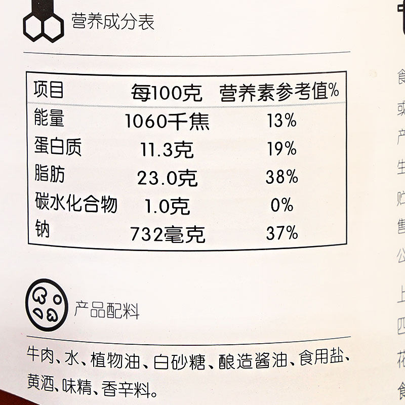 Beef, water, vegetable oil, white sugar, brewed soy sauce, edible salt, white wine, monosodium glutamate, spices, etc. The actual information on the product packaging shall prevail