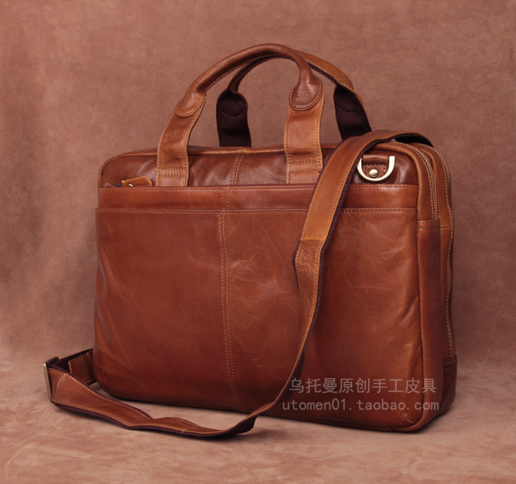 Original first layer cowhide men's bag business briefcase handmade leather double zipper portable shoulder bag 15 inch computer bag