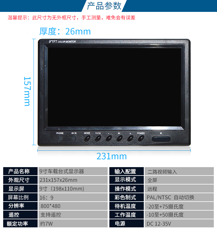 12 - 24V home satellite monitor HD 9 inch display security screen to anti - TV video video large screen