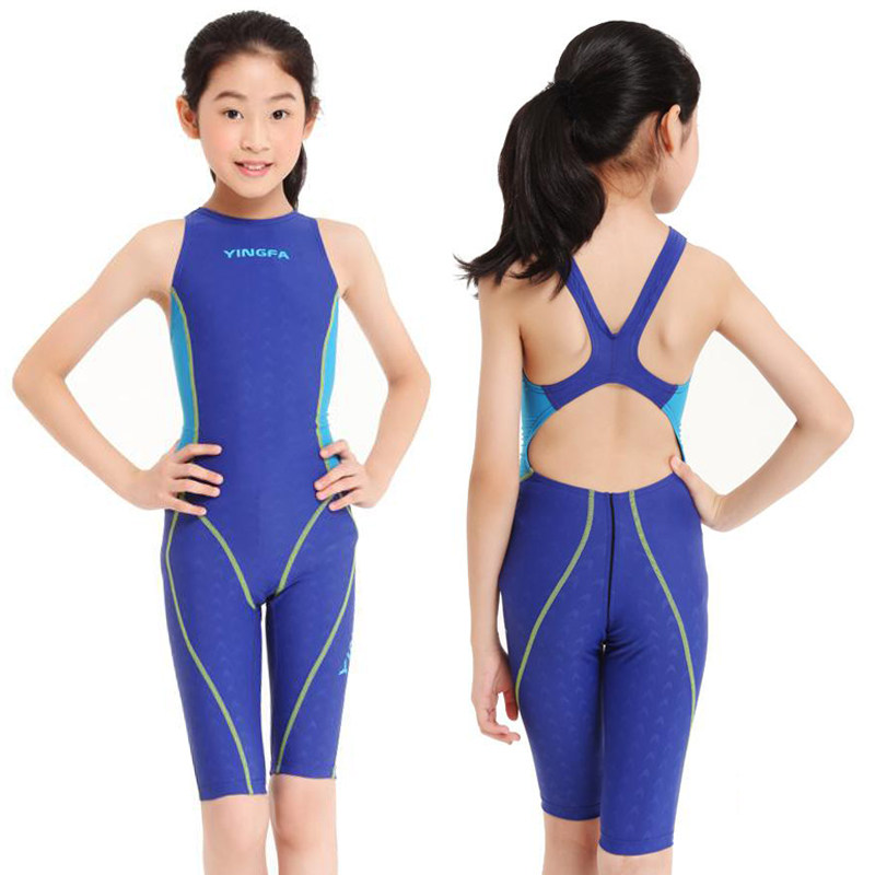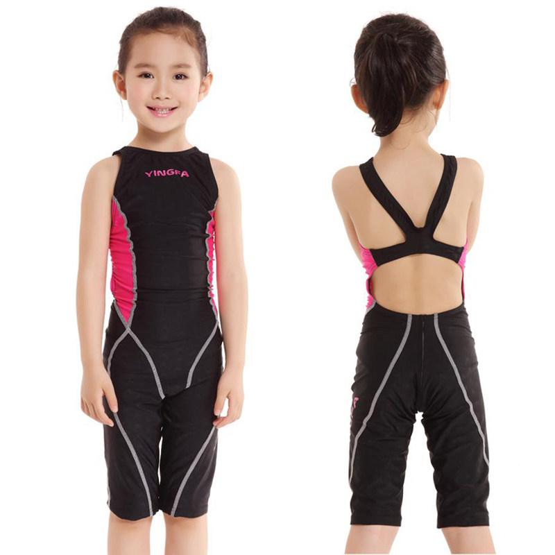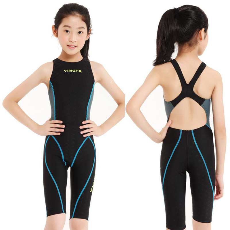 English-fashioned color-blocking girls racing one-piece five-point swimsuit mid-foot girls swimsuit training professional children's style