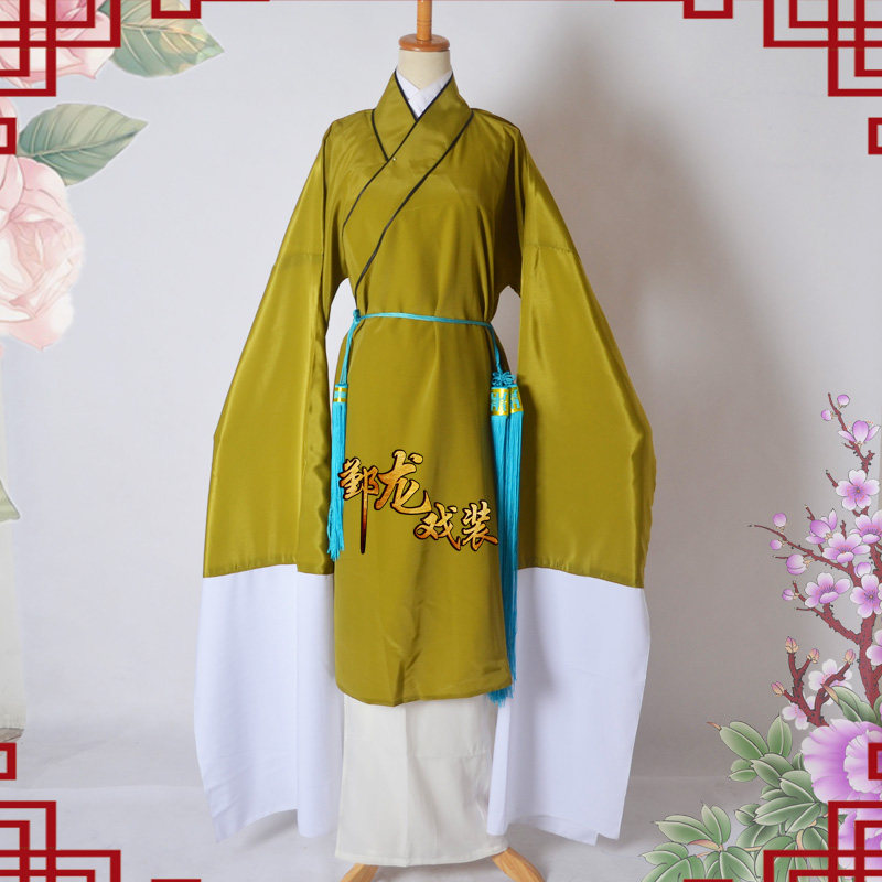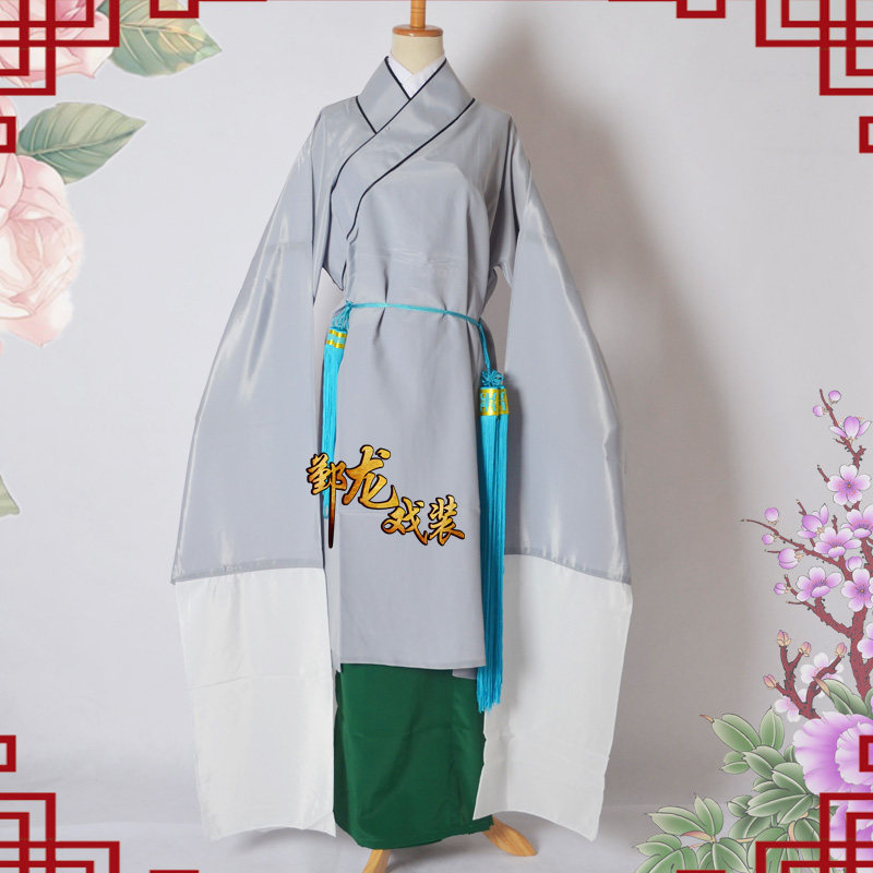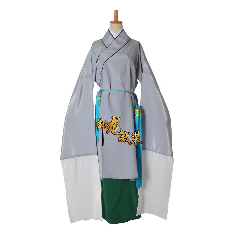 Plain gown with sewn water sleeves White skirt Blue-waisted plain gown with sewn water sleeves Dark green skirt Blue-waisted plain gown with sewn water sleeves