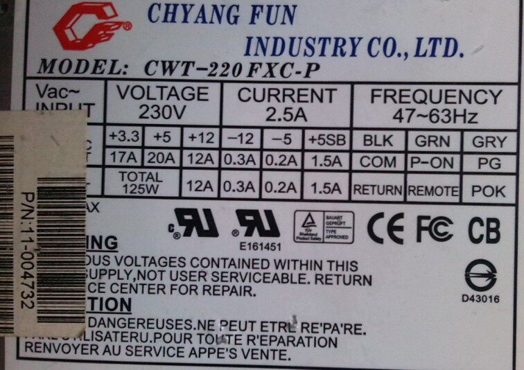 Original disassembler CWT-220FXC-P 220W power supply CHANG FUN INDUSTRY CO LTD