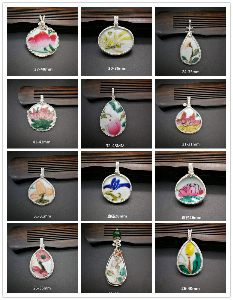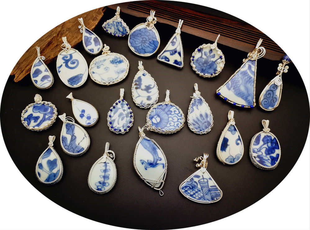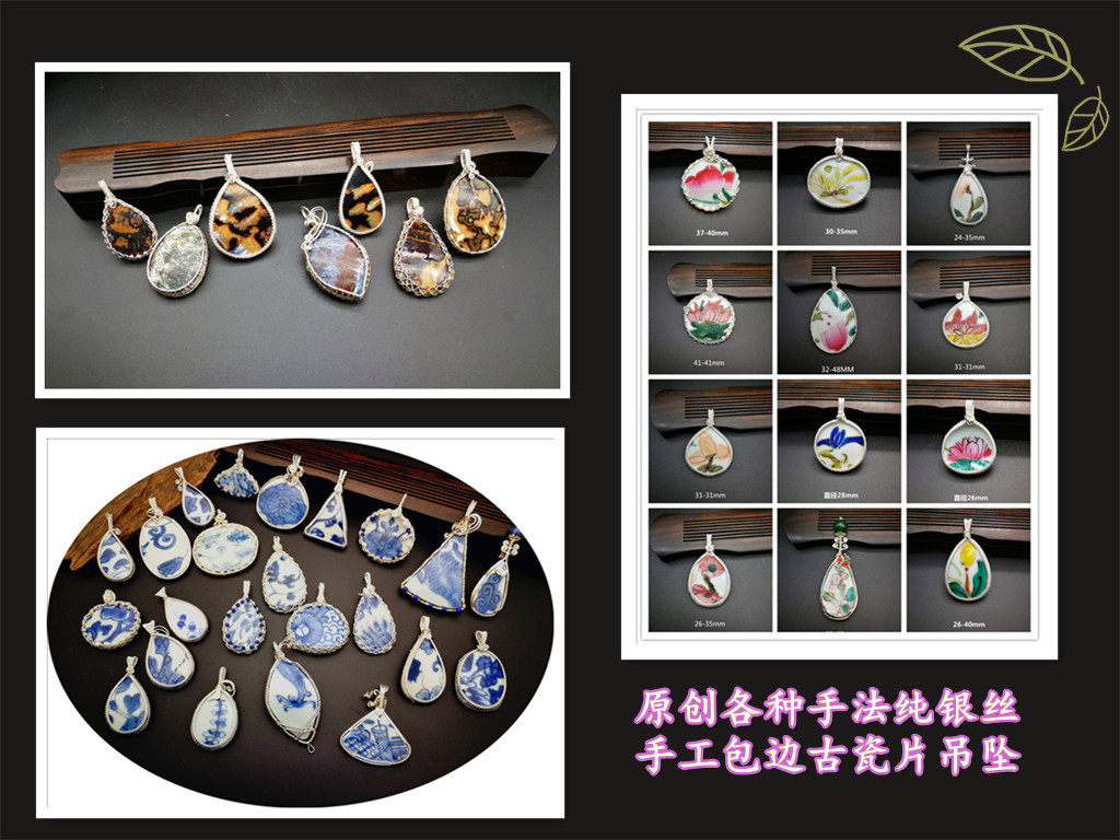 Ancient Porcelain Pieces Broken Porcelain Pendant Original various techniques pure silver silk handmade wrapping edge Song Ming Qingji State Blue Flower Pink