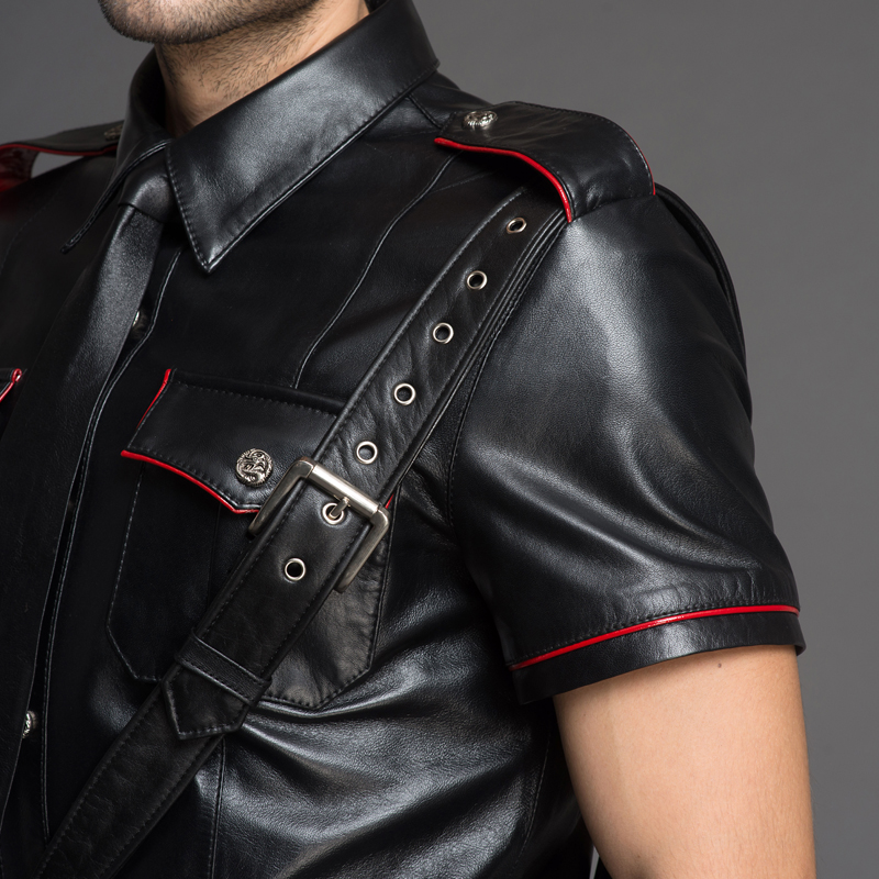 High-end custom genuine leather cow leather short sleeve shirt uniform leather lover Shang pint men's stage game leather man