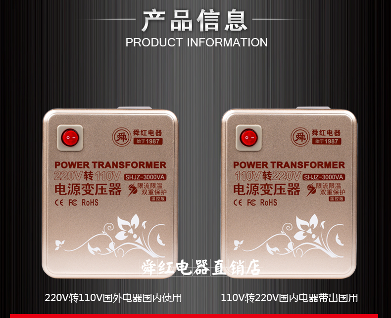 3000W For domestic use(220V to 110V) 3000W for foreign use (110V to 220V) 3000W for domestic use(220V to 100V)