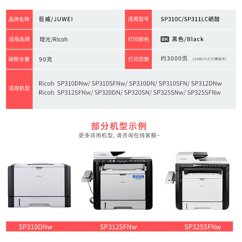 Juwei Suitable Ricoh sp325snw toner cartridge 325sfnw sp310sfnw printer sp310dn dnw SP310C ink cartridge SP3