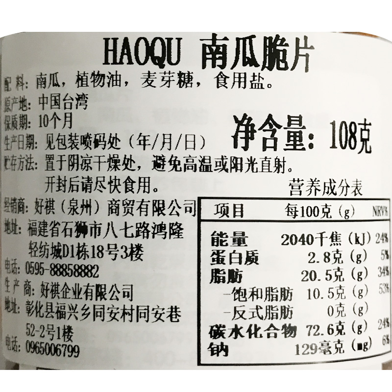 Haoqi Taiwan imported pumpkin dried 108g dehydrated vegetables dried fruits and vegetables dried pumpkin crisp snacks children pregnant women snacks