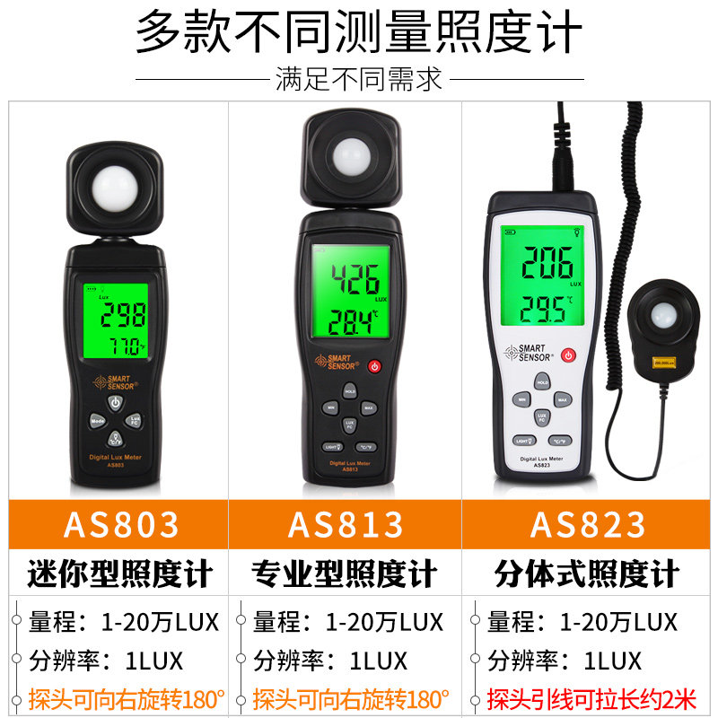 AS803 promotional model(range 0~200,000 LUX) AS803 promotional model charger set(range 0~200,000 LUX) ST9620 color screen model (range 0 ~ 200,000 LUX) AS803 promotional model charger set (range 0 ~ 200,000 LUX) ST9620 color screen model (range