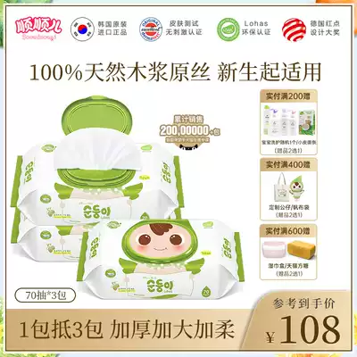 Shun Shun'er South Korea imported newborn hand wet paper towel baby special wet wipes baby green 70 draw 3 large bags