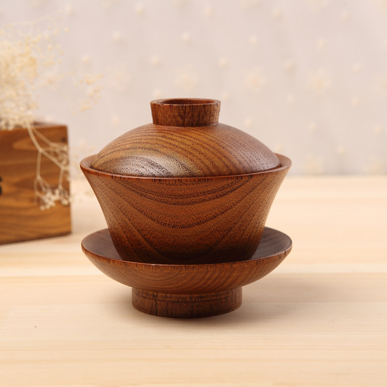 Japanese-style solid wood log tea cup, tea cup, tea bowl and tea bowl with a three-piece kungfu tea set, wooden tea bowl with a tea cover