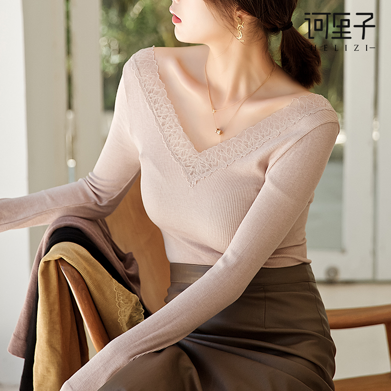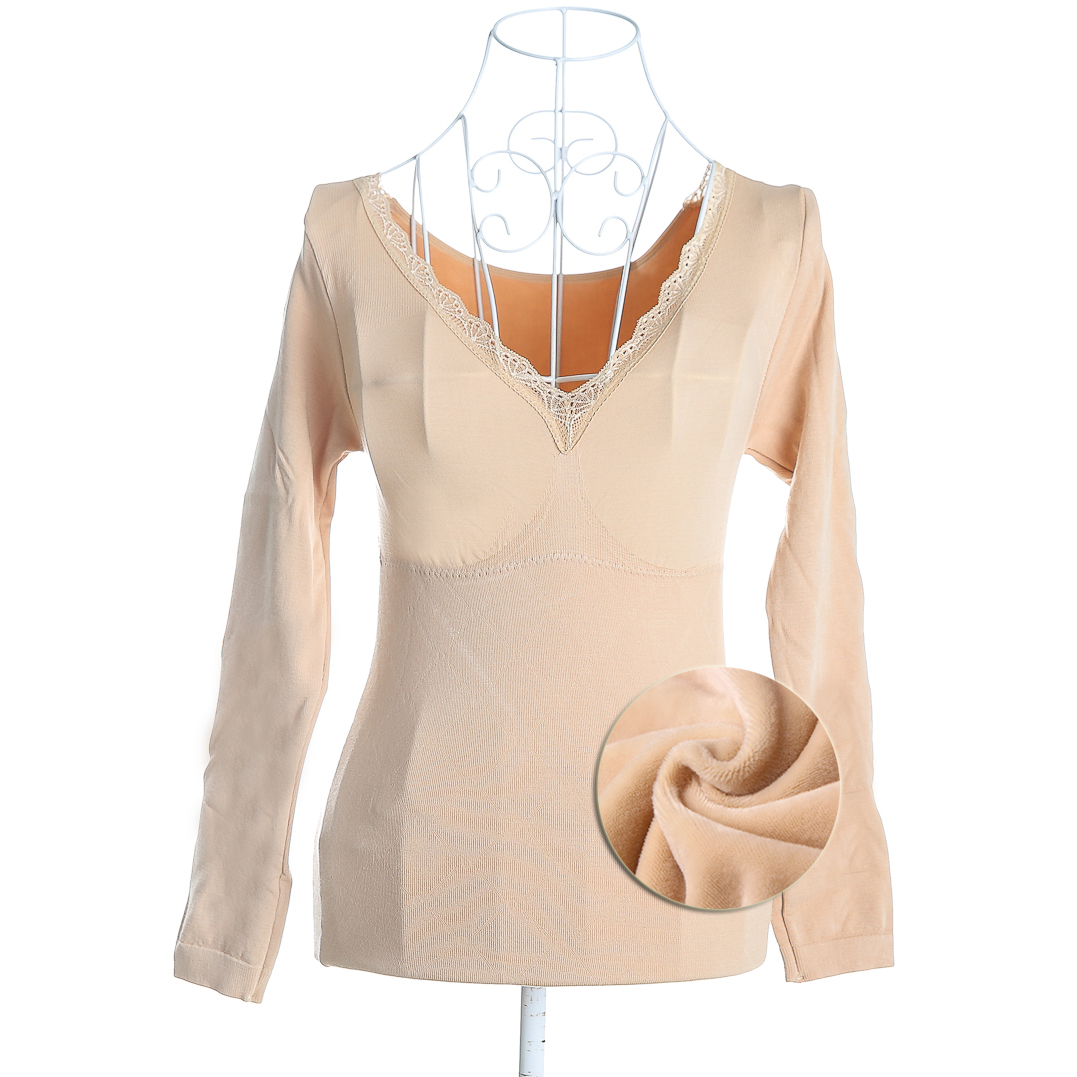 Autumn and winter single-piece top Lace large V-neck beauty body tight heating clothes women's thick velvet base cotton autumn coat