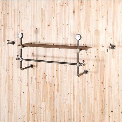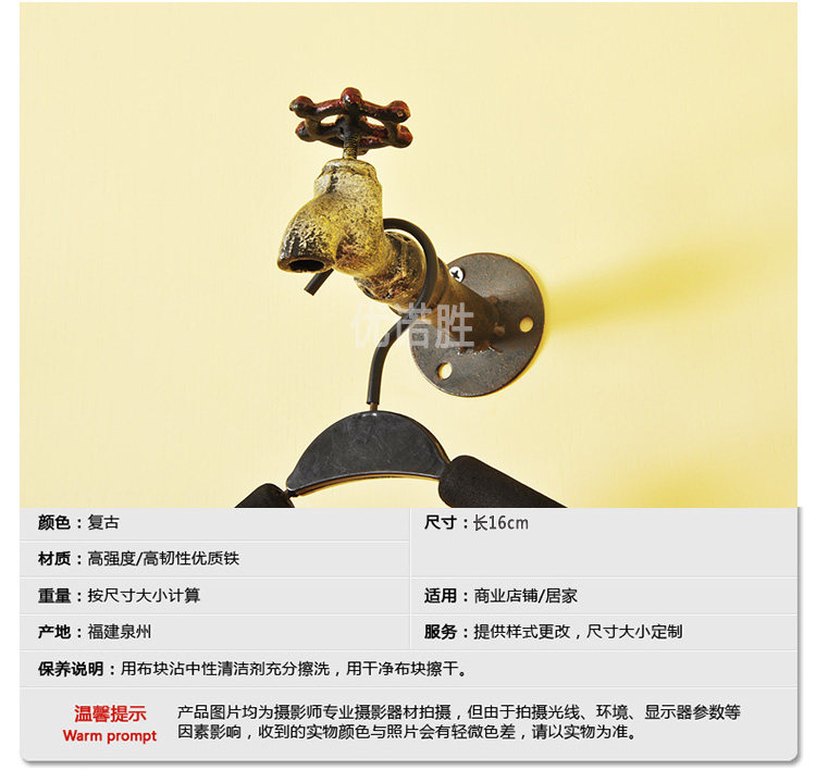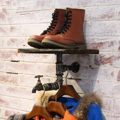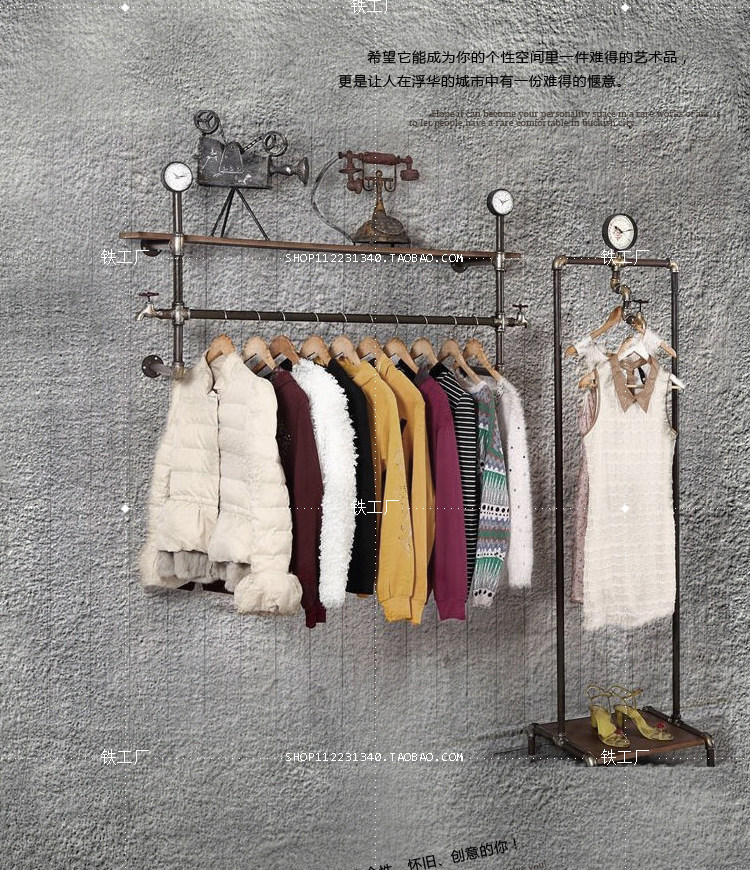 The iron clothing display rack of the ancient water pipe is hanging on the shelf of the clothing store with a tap hanging hanger on the side of the wall