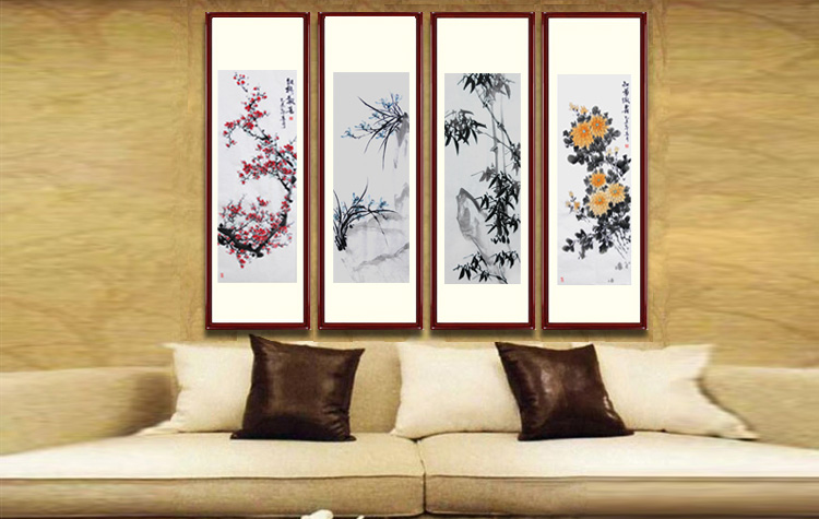 Hand-painted calligraphy and painting Flowers and birds Chinese painting Mei Lan bamboo chrysanthemum four screen quad painting real living room canvas strip calligraphy and painting works custom