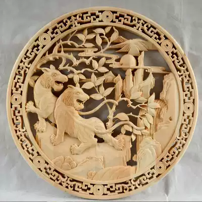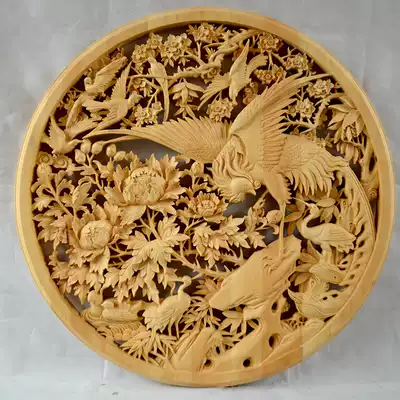 Dongyang wood carving 1m Basswood round pendant Phoenix peony hanging screen antique TV background wall decoration
