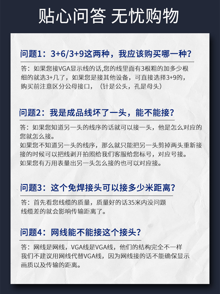(Thin) 3+6 Gold Plated Male + Screw MV601 (Thin) 3+6 Gold Plated Male head with nut MV601A (Thin) 3+9 Gold Plated Male Head + Screw Nut 9300 (Thin) 3+9 Gold Plated Female Head + Nut 9300A (Thin Metal Shell) 3+9 Gold Plated Male Head + Nut Nut 9301 (Thin Metal Shell) 3+9 Gold Plated Female Head + Nut 9301A (Thin) 3+6 Female With Nut MV603 (Thin) 3+6 Female Head with Nut MV603 (Thin) 3+6 Female Head with Nut MV603A 3+9 Male with screw MV911 3+9 Male with nut MV911A 3+9 Female with Screw MV913 3+9 Female with Nut MV913 3+9 Solid Needle Male with Screw Nut MV915 3+9 Solid Needle Female with Screw Nut MV916 (Snap)3+6 Male with Screw MV605 (Snap)3+6 Male with Screw MV606 (Snap)3+6 Male with Nut MV606 (Snap-in)3+6 Male with Nut (Snap-in)3+6 Male with Nut (Snap-on)3+6 Female with Nut Single VGA3+6 Unsoldered Male Head Without Shell Single VGA3+ 6 weld-free female head shellless single VGA3+9 welded male without shell Single VGA3+9 weldless female head without shell Repair replacement VGA wire connector (VGA3+9 weldless male head with screw) 2