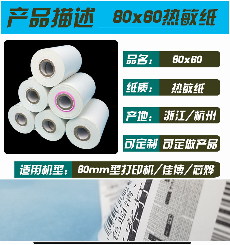 80x60 (100 roll diameter 52) 80x60 (120 roll diameter 52) Thermal paper 57*40 (200 rolls) Cash register paper 80x50 (43mm) 120 rolls small rubber core 57x50 (100 rolls)