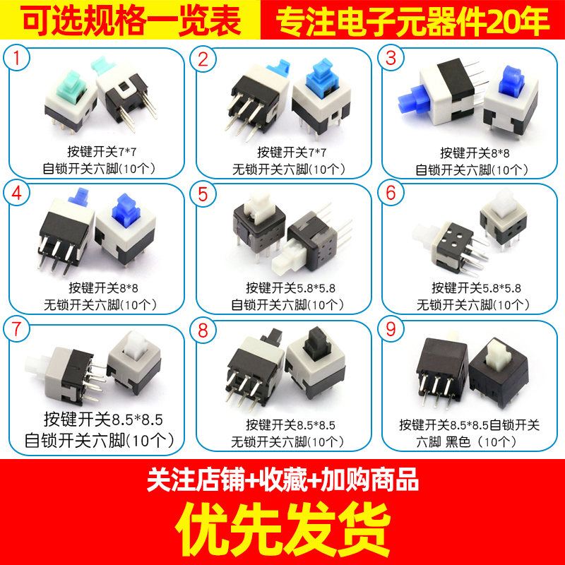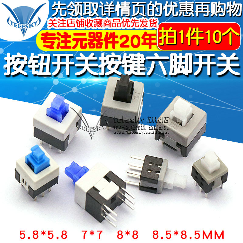 Push button switch button six-pin switch 5 8*5 8 7*7 8*8 8 5*8 5MM self-locking lockless switch 6 feet