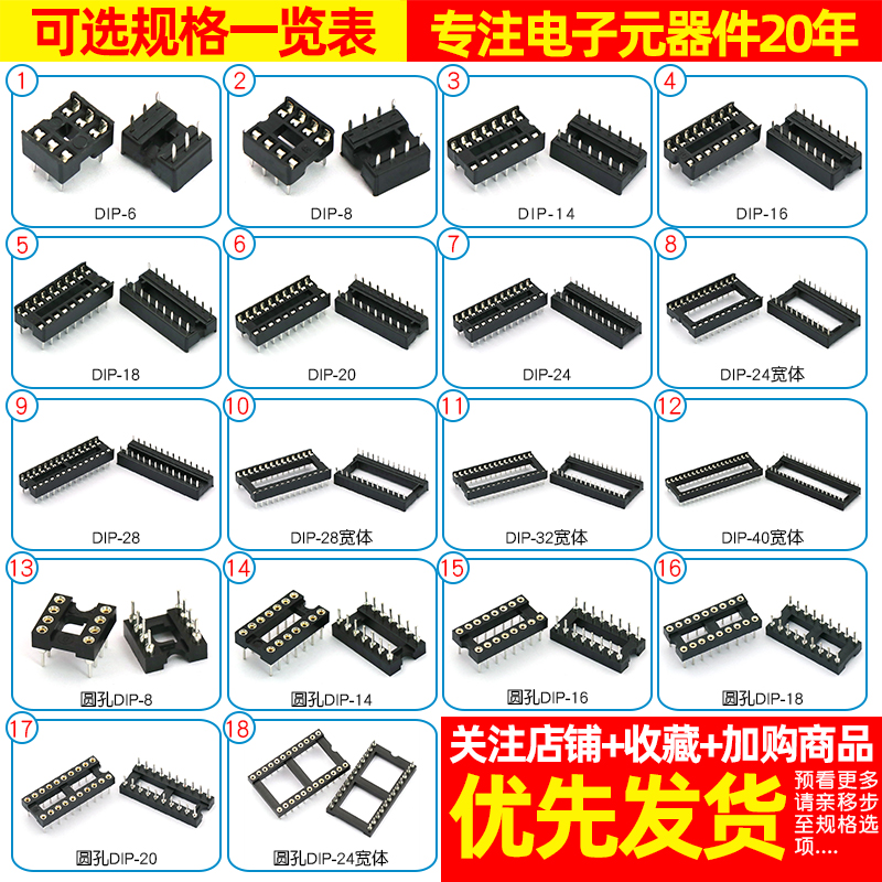 IC socket DIP-6 (80pcs) IC socket DIP-8 (60pcs) IC socket DIP-14(34pcs) IC socket DIP-16(30pcs) IC socket DIP-18(26pcs) IC socket DIP-20(24pcs) IC socket DIP-24(20pcs) IC socket DIP-28(17pcs) IC socket (wide body)DIP-24(20pcs) IC socket (wide body)DIP-28(17pcs) IC socket (Wide body) DIP-32 (15pcs) IC socket (wide body) DIP-40 (12pcs) IC socket Round hole DIP-8 (5pcs) IC socket Round hole DIP-14 (5pcs) IC socket Round hole DIP-16(2pcs) IC socket Round hole DIP-18(2pcs) IC socket Round hole DIP-20(2pcs) IC socket DIP-24 round hole wide body (2pcs) IC socket DIP-24P round hole narrow body (2pcs) IC socket Round hole DIP-28(2pcs) IC socket DIP-28 round hole wide body (2 pcs) IC socket DIP-32 round hole wide body (2 pcs) IC socket DIP-40 round hole wide body (1 pc)