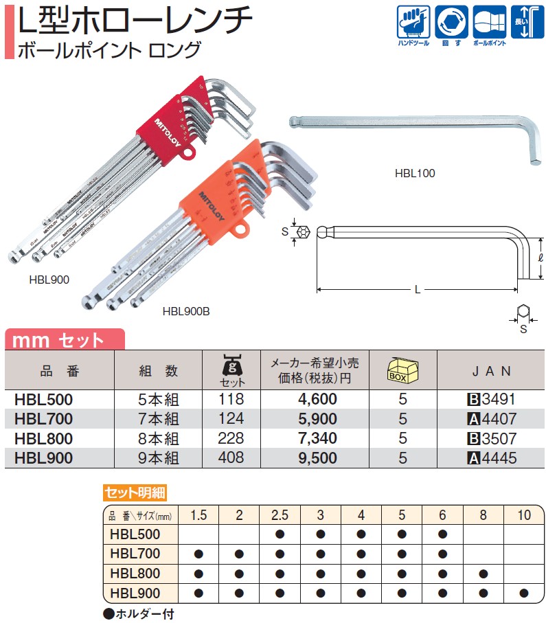 MITOLOY Japanese water household machinery HBL900B inner hexagon wrench plus long English group set of original clothing imports