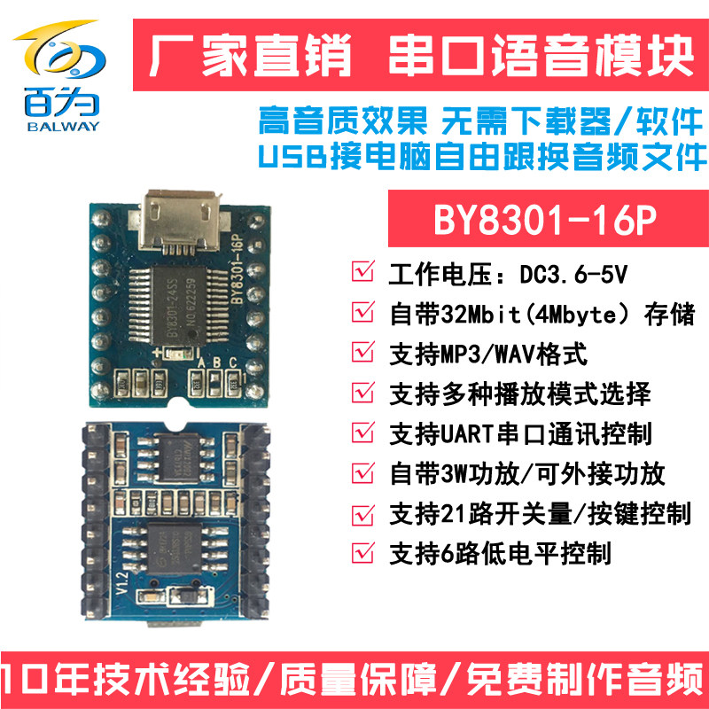 Serial voice module MP3 chip playing board amusement audio sound broadcast USB download BY8301-16P