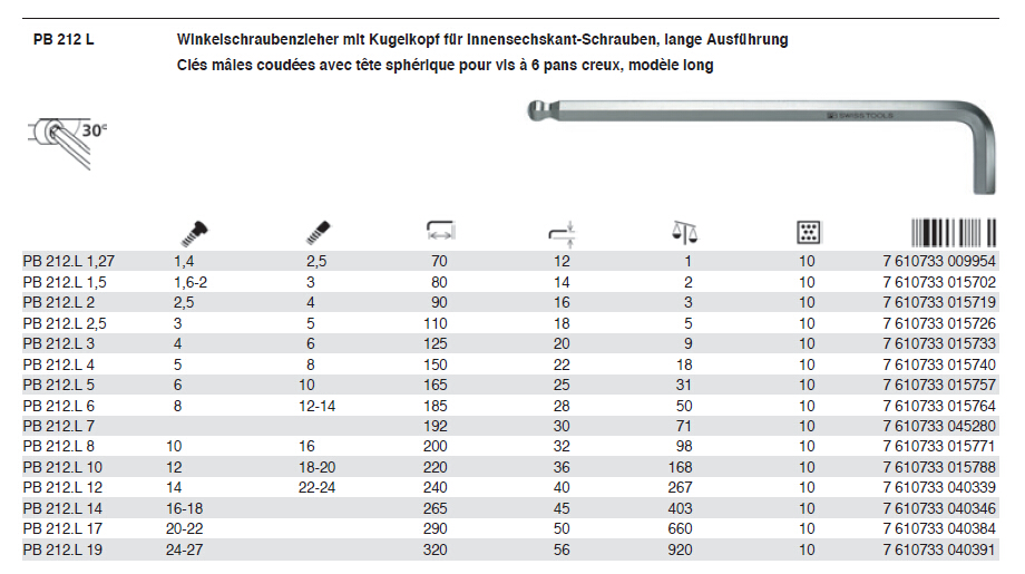 Swiss PB 212LH-5 6 8 10 extended ball head inner hexagonal wrench metric hexagonal key