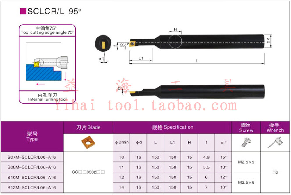 95 degree screw type inner hole turning tool S07M S08M S10M S12M-SCLCR06-A16