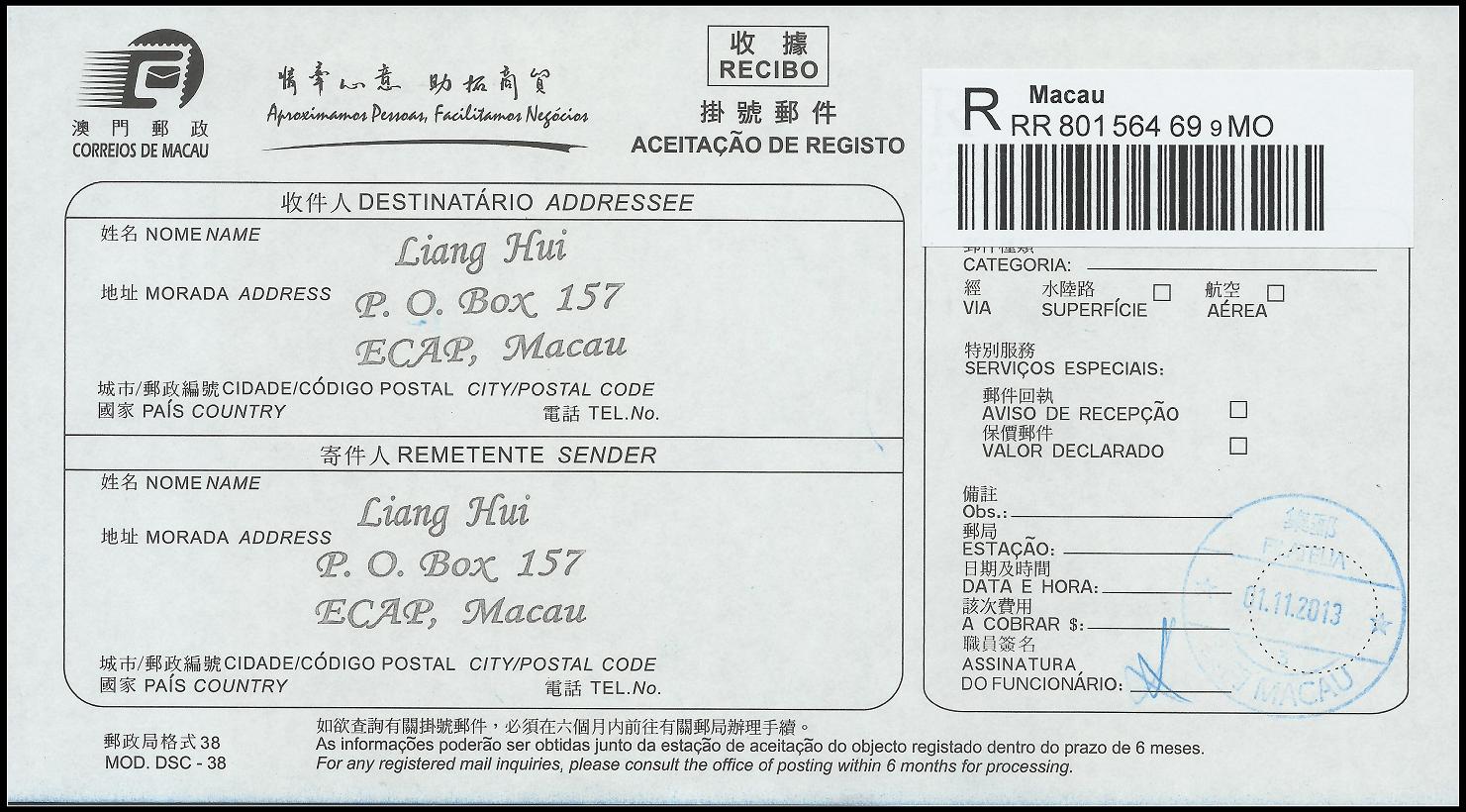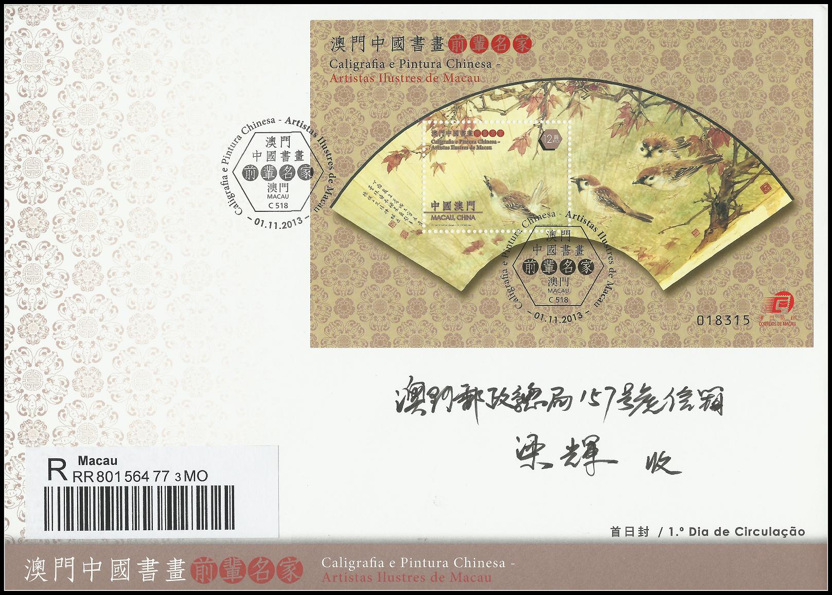 2013 Macao Chinese Painting and Calligraphy Forebears stamp sheetlet registered on the first day of the first day of the collection with receipts