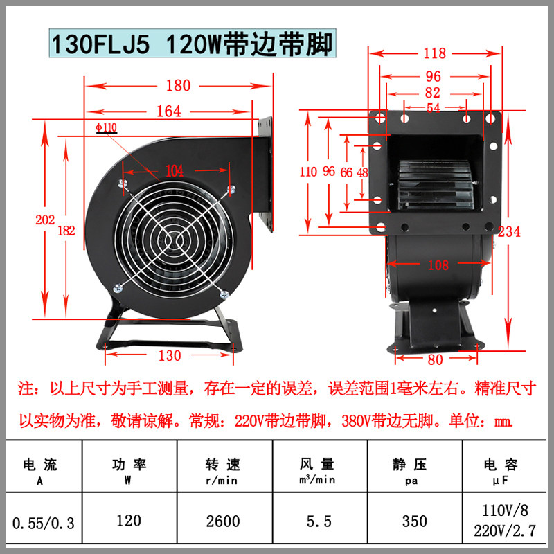 Small industrial frequency centrifugal fan 130FLJ5 220V 380V 110V 120W full copper wire heat dissipation blower