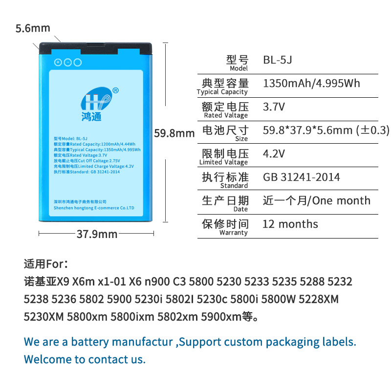 Hon Thong is suitable for NOKIA5800 BL-5J BL-5J n900 5288 Old models X6 5230 2010520525 5233