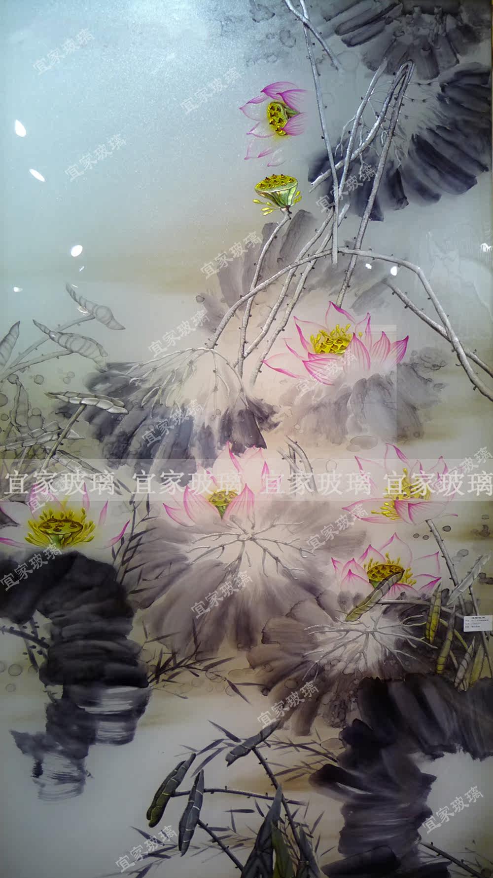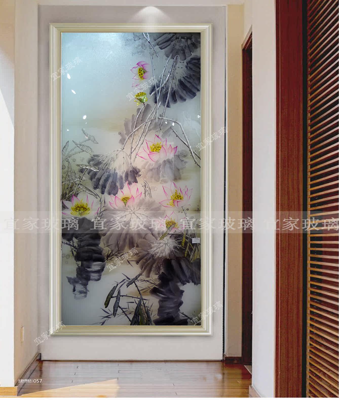 Shanghai art glass porch background painting partition screen TV background ink lotus three-dimensional deep carving