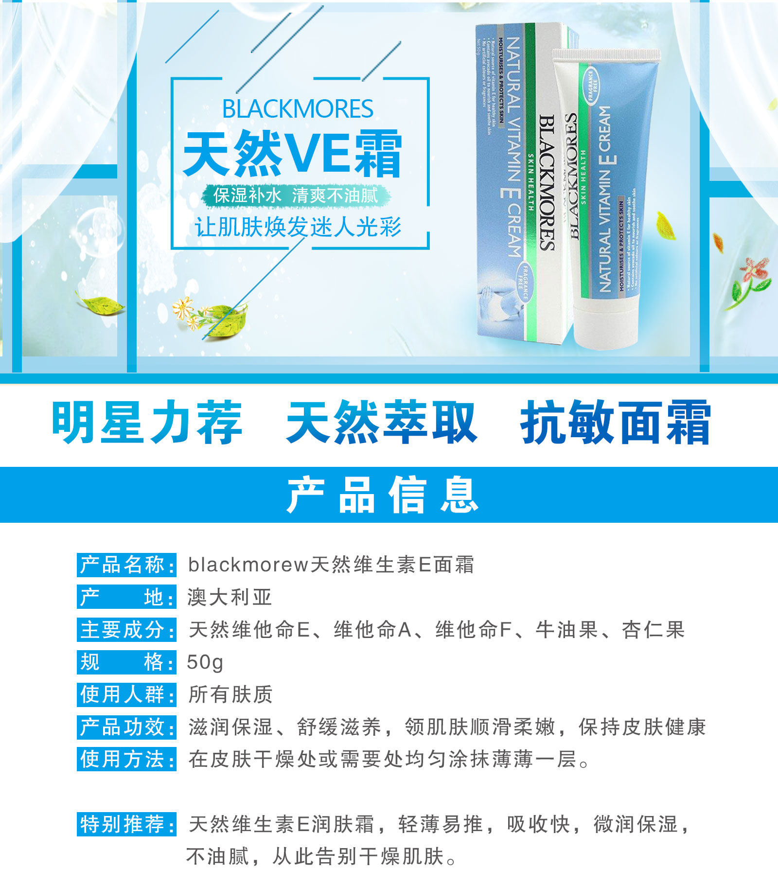 Kangaroo Chick Australia Straight Mail Blackmores Vitamin E Nourishing Cream VE Face Cream Moisturizing Moisturizing 50g
