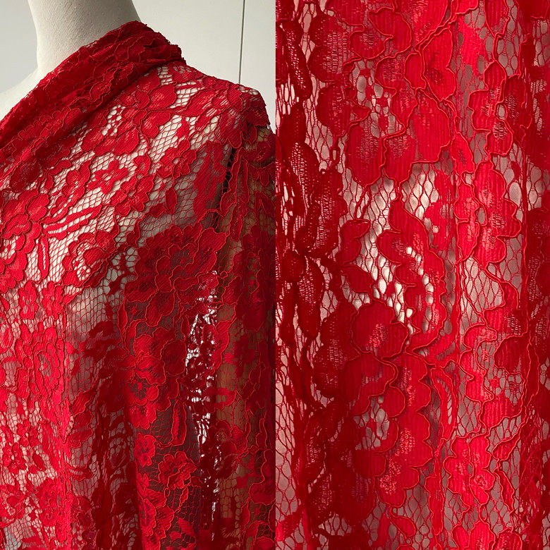 Red lace fabric Exquisite three-dimensional hollow car bone lace fabric Thick peony flower keel embroidery dress drape