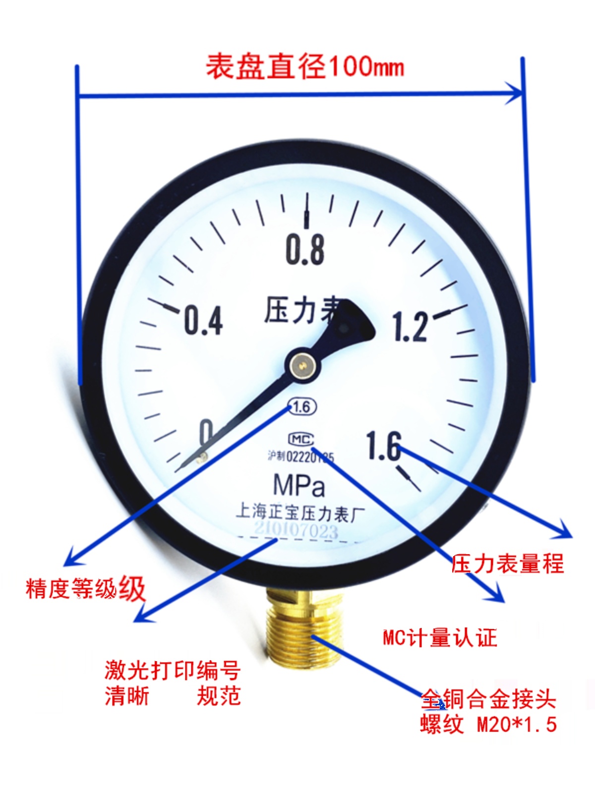 Ordinary pressure gauge Y100 Zhengbao pressure gauge 0-1 6MPa water gas boiler pressure gauge full specifications