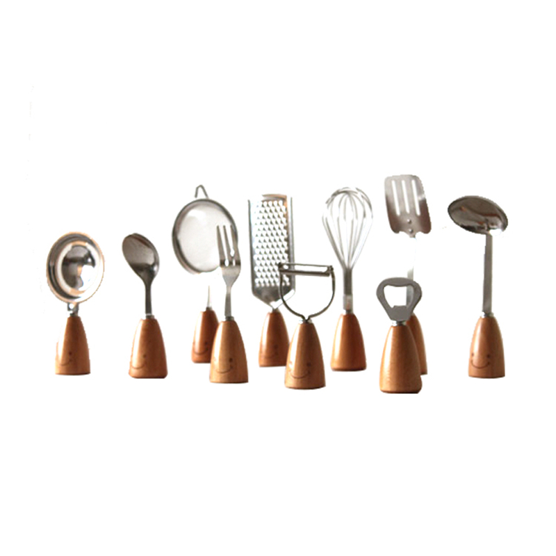 Wooden handle smiley face series stainless steel wooden fork spoon tableware set, cutter, bottle opener, corkscrew, egg beater