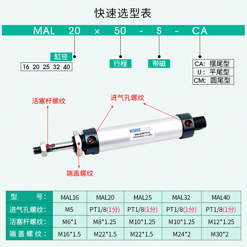 MAL25 * 25 50 75100 125150200250300S-CA Yadeguest type aluminium alloy mini cylinder