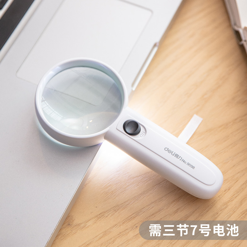 Deli magnifying glass Handheld HD portable size lens 11 times LED light optical magnifying glass for the elderly children and students science reading newspaper identification for the elderly Outdoor mobile phone repair