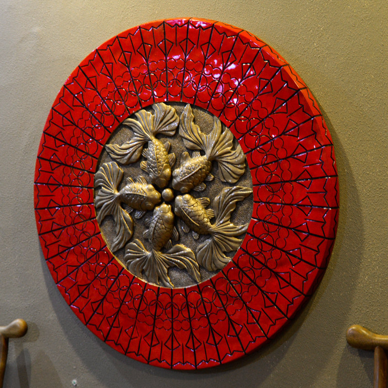 New Chinese-style retro living room pendant dining room background wall relief mural home decoration painting mural decoration Wufu goldfish