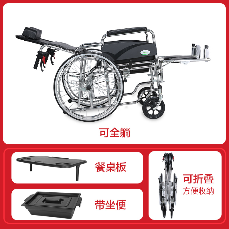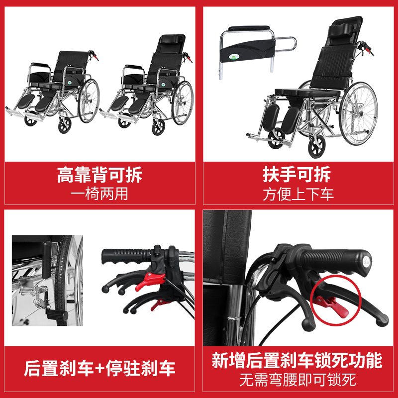 With handbrake armrest, can be lifted, foot pedal can be removed, anti-backward sliding, high backrest, full lying, high backrest, half lying