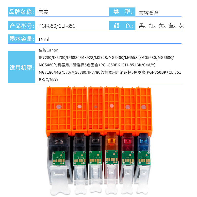 Zhimei applies Canon 850 851 ink cartridges MG7580 6400 7180 IX6880 IX6780 IP7280 MX928