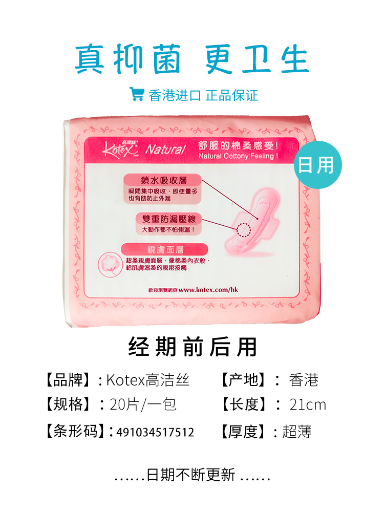 Hong Kong Kotex leans on sanitary cotton pro-skin cotton noodles ultra-thin winged daily sanitary cotton 21CM-20 sheet