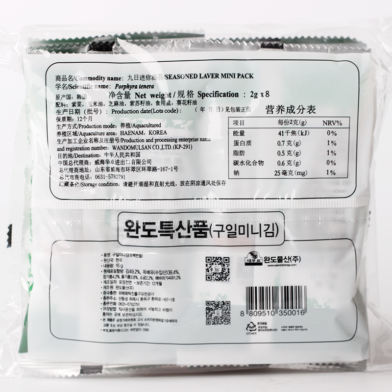 Nine days Korea imported seaweed 2g packaging ready-to-eat children's mini snack sushi seaweed grilled seaweed crisps